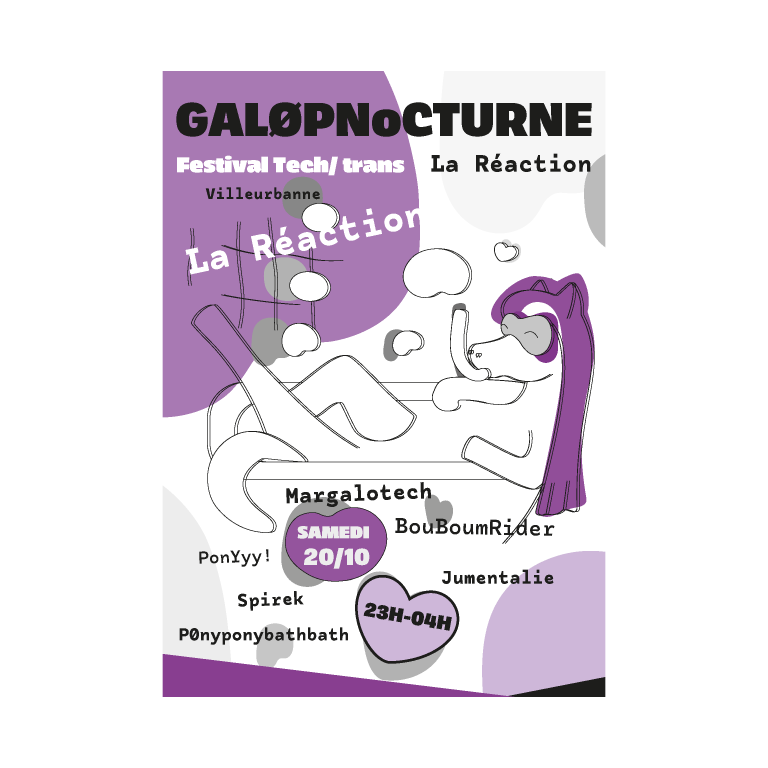 Objectif : Concevoir une affiche grand format pour annoncer « Galop Nocturne », un festival Tech/Trance à Villeurbanne, accueillant des artistes locaux dans une ambiance immersive et décalée. L’affiche, doit à la fois respecter les codes visuels de la musique électronique et s’en distinguer par une thématique originale autour du cheval.
